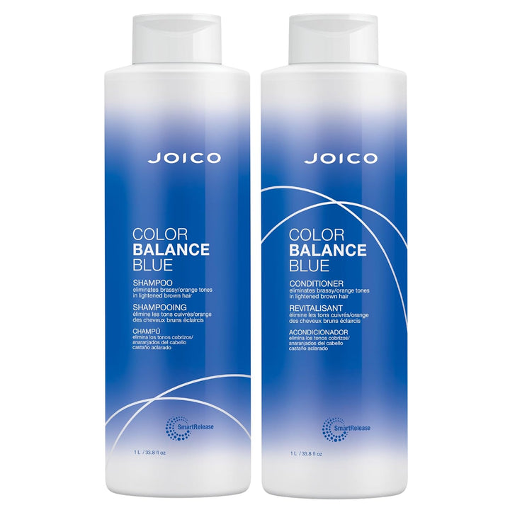Joico Color Balance Blue Shampoo & Conditioner Duo Set by Joico helps neutralize unwanted orange and brassy tones in highlighted, lightened, or naturally brunette hair while keeping it healthy, shiny, and smooth. The blue shampoo gently cleanses away buildup and impurities, depositing tone-correcting pigments that cool warm undertones for a fresher, more balanced look. The conditioner complements the shampoo by adding moisture, shine, and manageability, leaving hair soft, glossy, and easy to detangle. Together, they help maintain salon-fresh color vibrancy, keeping brunette and darker blonde shades rich, even, and radiant between salon visits.
