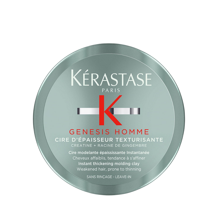Kerastase Genesis Homme Cire d'epaisseur Texturisante Wax Pomade is a light-hold styling solution that instantly thickens weakened hair prone to thinning. This versatile pomade offers texture and volume with a matte finish while maintaining a non-sticky feel. Enriched with Creatine and Ginger Root, it strengthens hair fibers and protects against damage. The flexible hold ensures your hair stays manageable throughout the day, making it perfect for creating defined, layered looks without weighing the hair down.